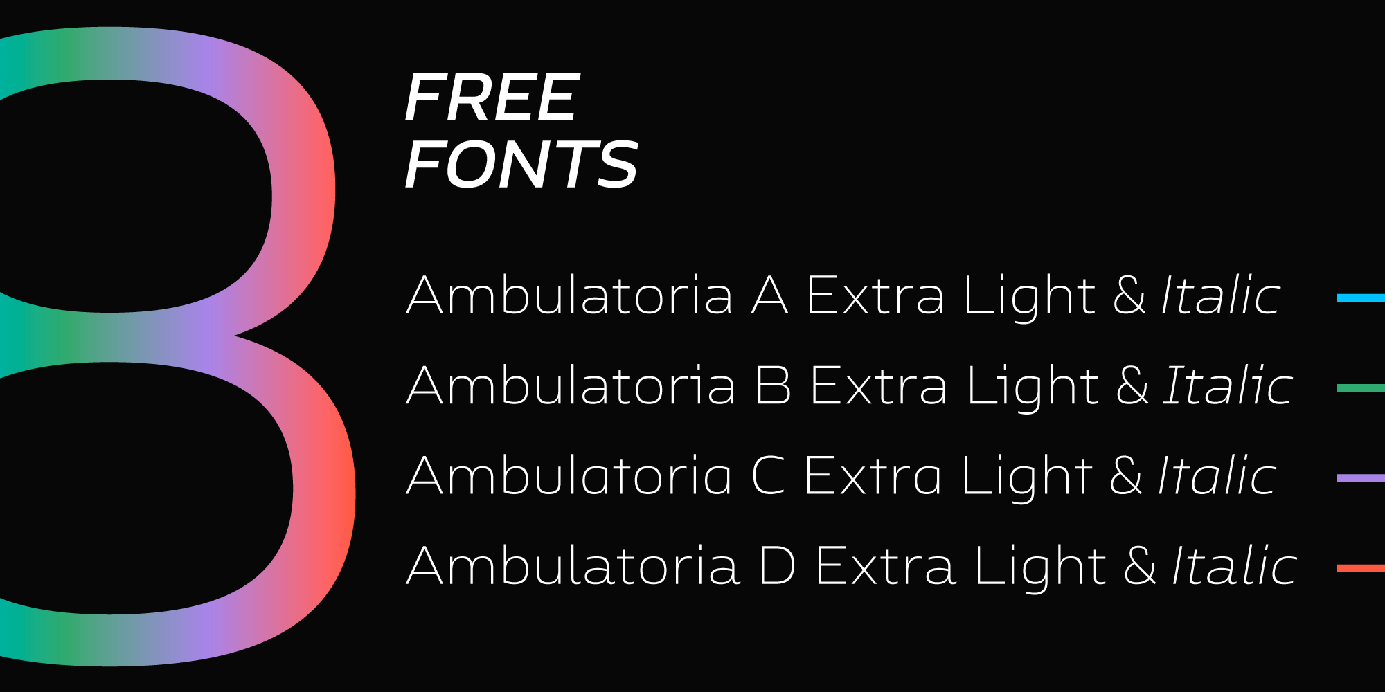 Ambulatoria is a sturdy open aperture sans-serif that comes in four variations. Each variation, A, B, C, and D, contains alternative variants for certain glyphs that allow the designer to change character and texture of the text.