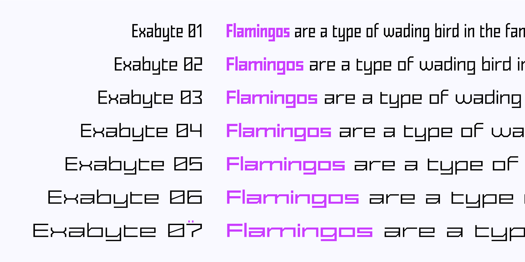 Exabyte is a modular display sans-serif prevailed by 90º angles. Its 63 plain styles consist of 7 widths and 9 weights. Each heaviest weight also comes in Outline and Engrave styles (non-layerable) in all 7 widths, bringing the overall style count to 77.